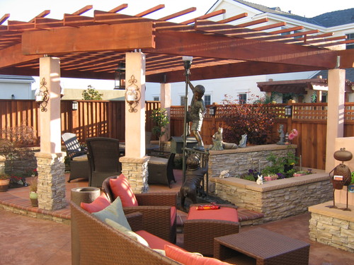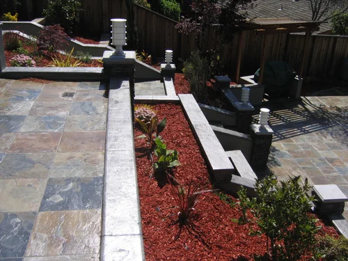 Design: A mix of natural and man-made materials was used to create the semi-modern and inviting out-door spaces, giving the existing square footage maximum spatial impact. For the front, multi-colored slate tiles in a crisscross pattern, bono bricks, inset lighting, and landscaping create a formal, inviting entrance to an otherwise narrow front door. For the center courtyard, natural flat stones blend into concrete stamping for cost effectiveness, at the same time bringing interesting texture into concrete. A water fountain is set into a new wall with veneer stone capping, creating a relaxing backdrop for seating area. The curvy border of the concrete-stamped footpath leads to another small backyard with trellis and seating area beneath.